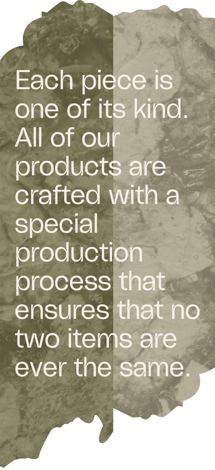 We employ natural dyeing techniques, using colors extracted from food ingredients, herbs, and natural stones, all of which are completely biodegradable. Each surface and object we create is meticulously handcrafted, resulting in a unique combination of textures, colors, and patterns. When no longer in use, our products are 100% compostable. The composite material we develop can be pressed, extruded, 3D printed, thermoformed, heat bent, or formed through injection molding.